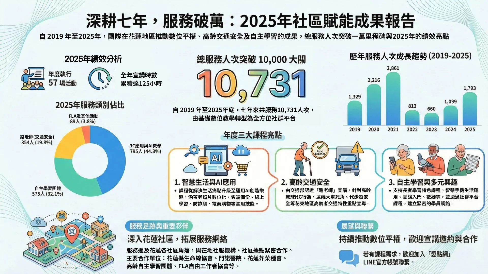 自 2019 年起深耕花蓮與鄰近地區,致力於推動數位平權、高齡交通安全及自主學習,本團隊歷經七年的持續投入,於 2025年正式迎來重要里程碑——歷年總累計服務人次突破 10,000 人次。